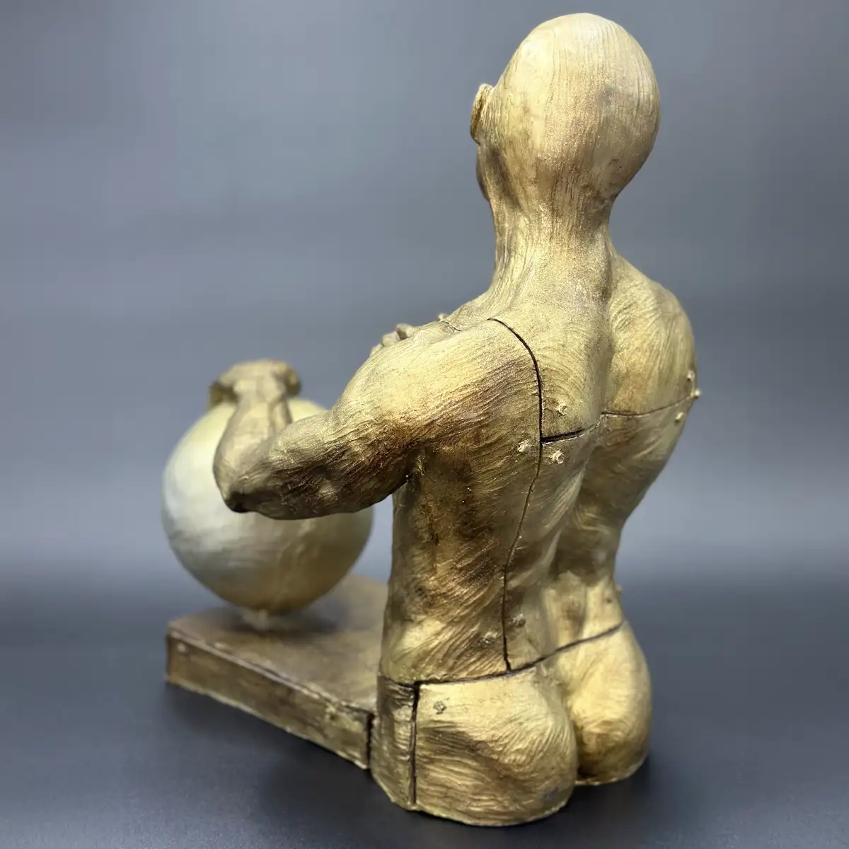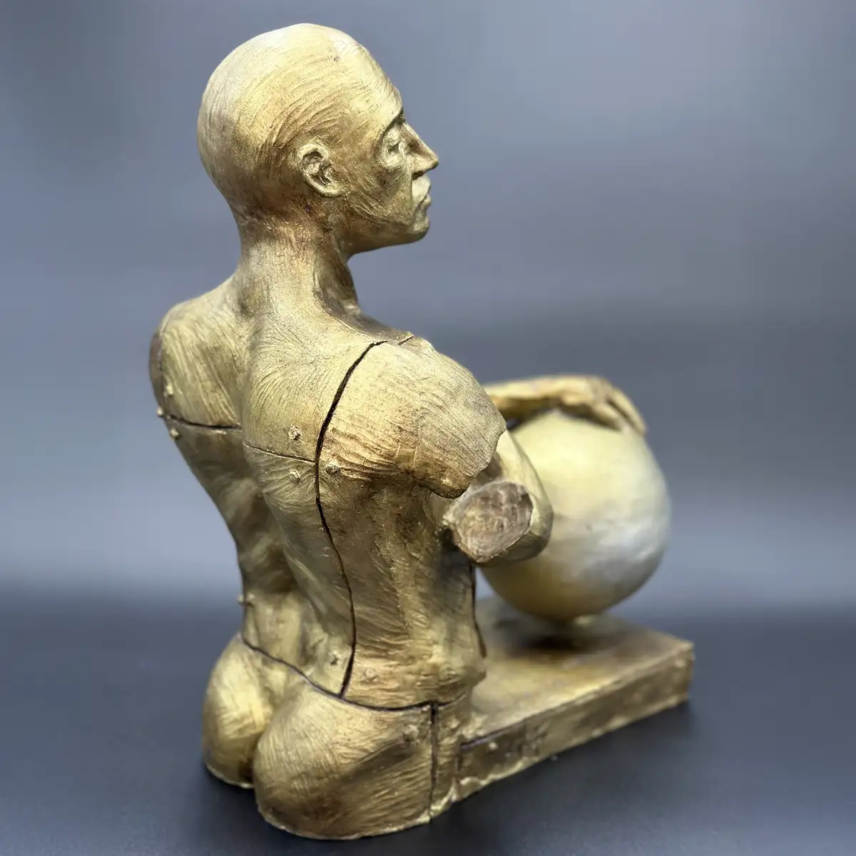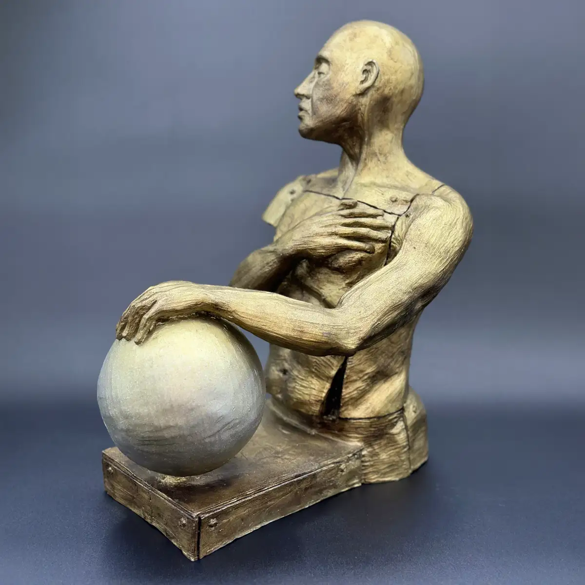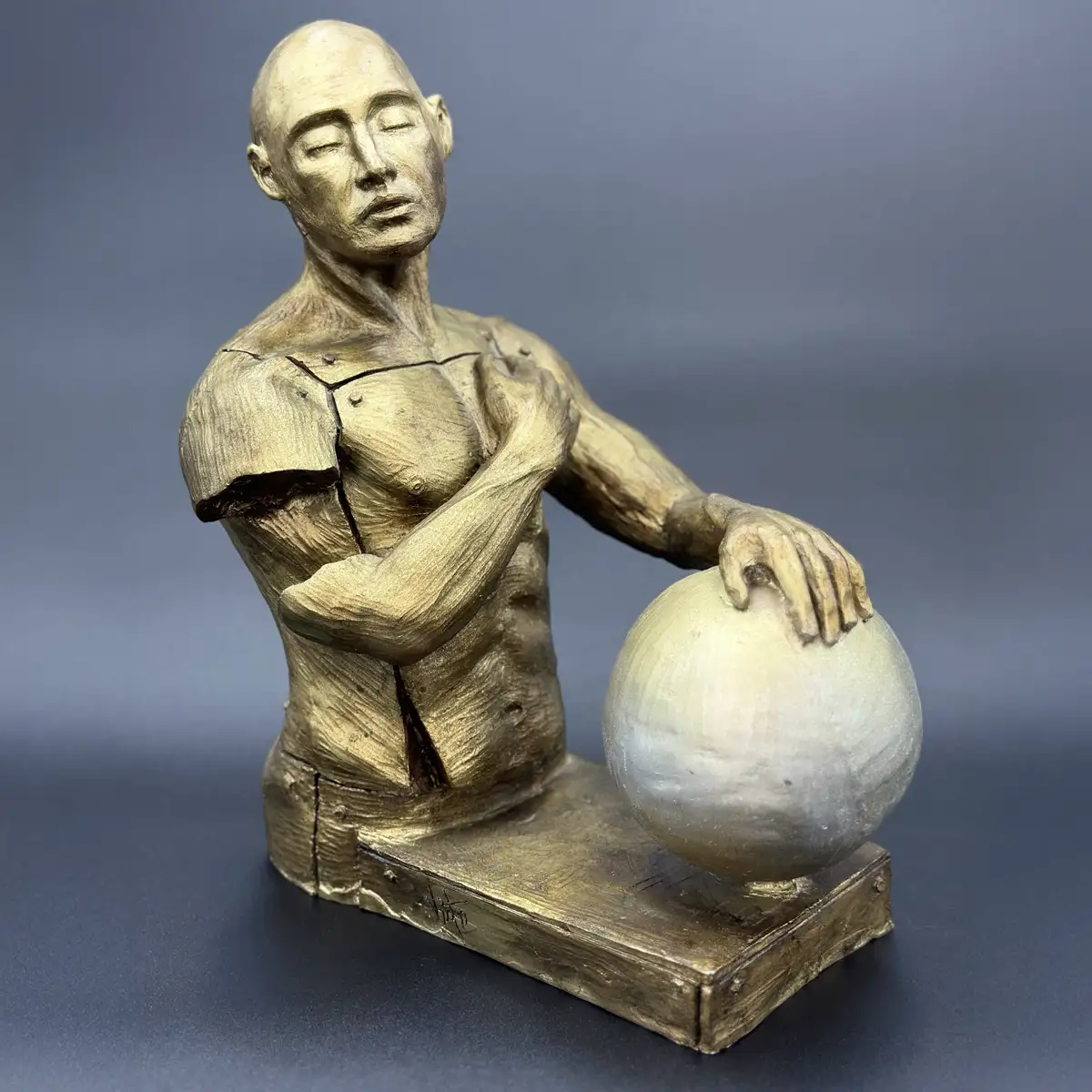 La figura humana se presenta visiblemente fragmentada, como un cuerpo ensamblado que metaforiza la desconexión del individuo con su esencia intangible. Mientras una de sus manos reposa sobre una esfera —símbolo del mundo material y la experiencia terrenal—, la otra se lleva al corazón en un gesto de profunda introspección. Con los ojos cerrados, el ser no mira hacia afuera, sino hacia adentro, en un despertar de la consciencia a esta dualidad que lo constituye.